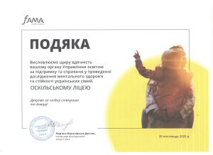 Дослідницька агенція Fama щиро дякує Оскільському ліцею за підтримку та допомогу в залученні респондентів до Всеукраїнського дослідження ментального здоров’я та стійкості українських сімей. Наша співпраця стала важливою частиною успішної реалізації цього проєкту! Молодці!