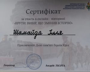 Учень 5 класу Оскільського ліцею ШАМАЙДА ІЛЛЯ успішно долучився до ОНЛАЙН-ВІКТОРИНИ, присвяченій ДНЮ ПАМʼЯТІ ГЕРОЇВ КРУТ: «Крути: вибір, що змінив історію».